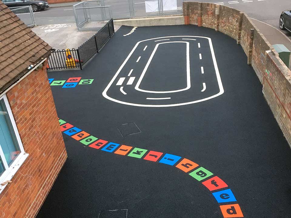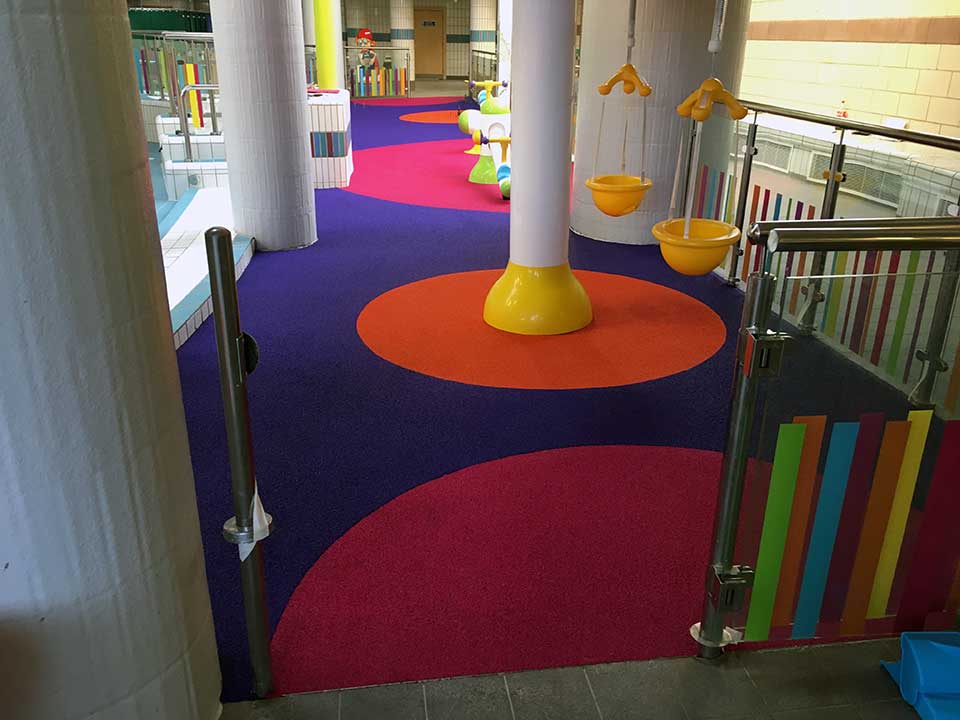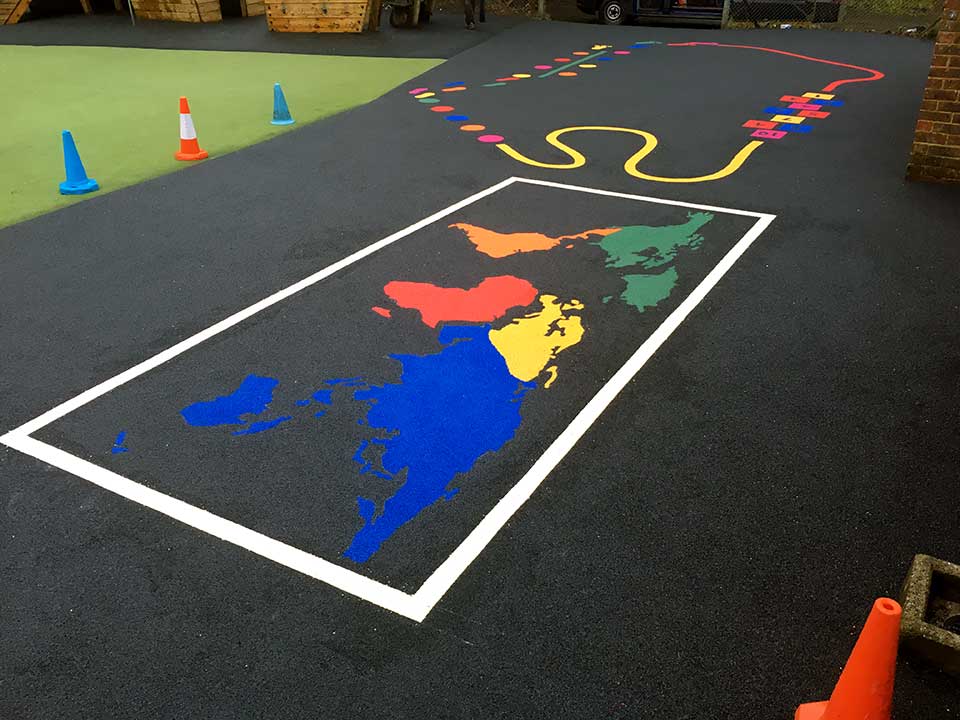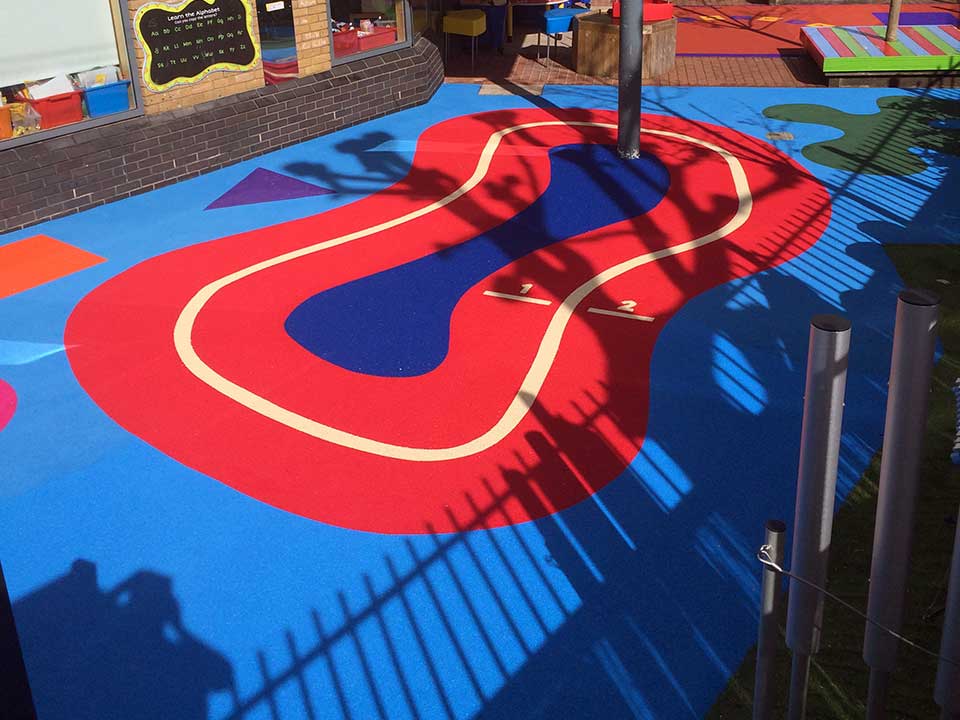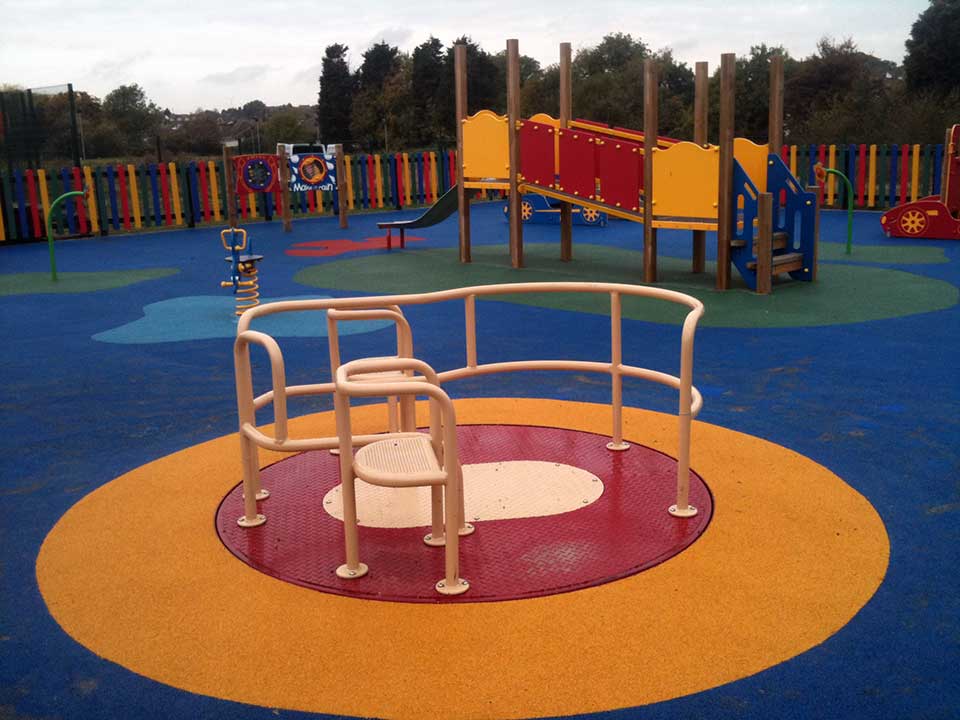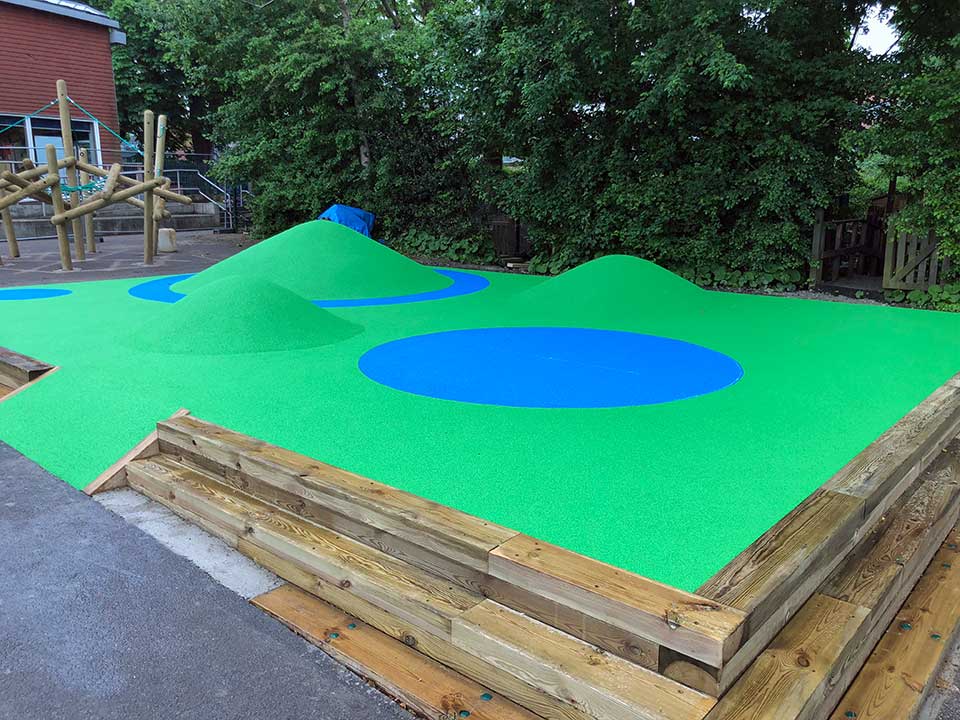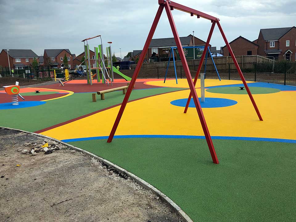 This product is usually made up of a two-layer system, the bottom layer is a re-cycled rubber crumb which can be laid at various depths to suit the critical fall height of the area. The second layer is EPDM (Ethylene Propylene Diene Modified) hard wearing rubber crumb which as stated above comes in a variety of colours and is suitable for all-year round play as it is porous system.
